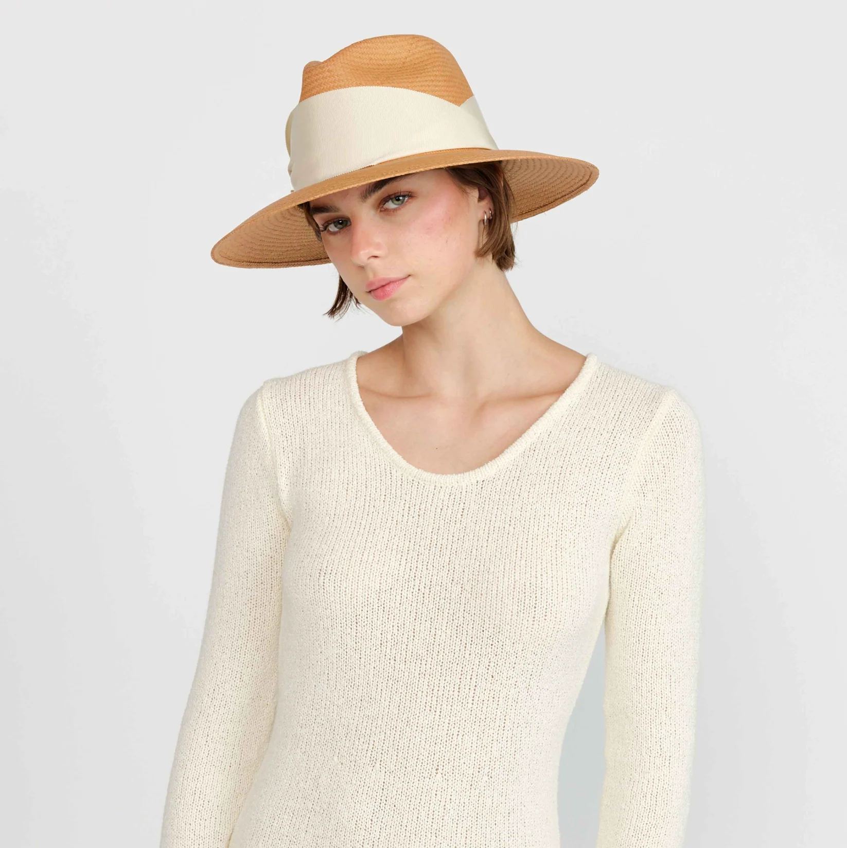 - Camel straw fedora with broad brim and oversized bone grosgrain band, wrapped asymmetrically around the hat and finished with a modern angular fold.