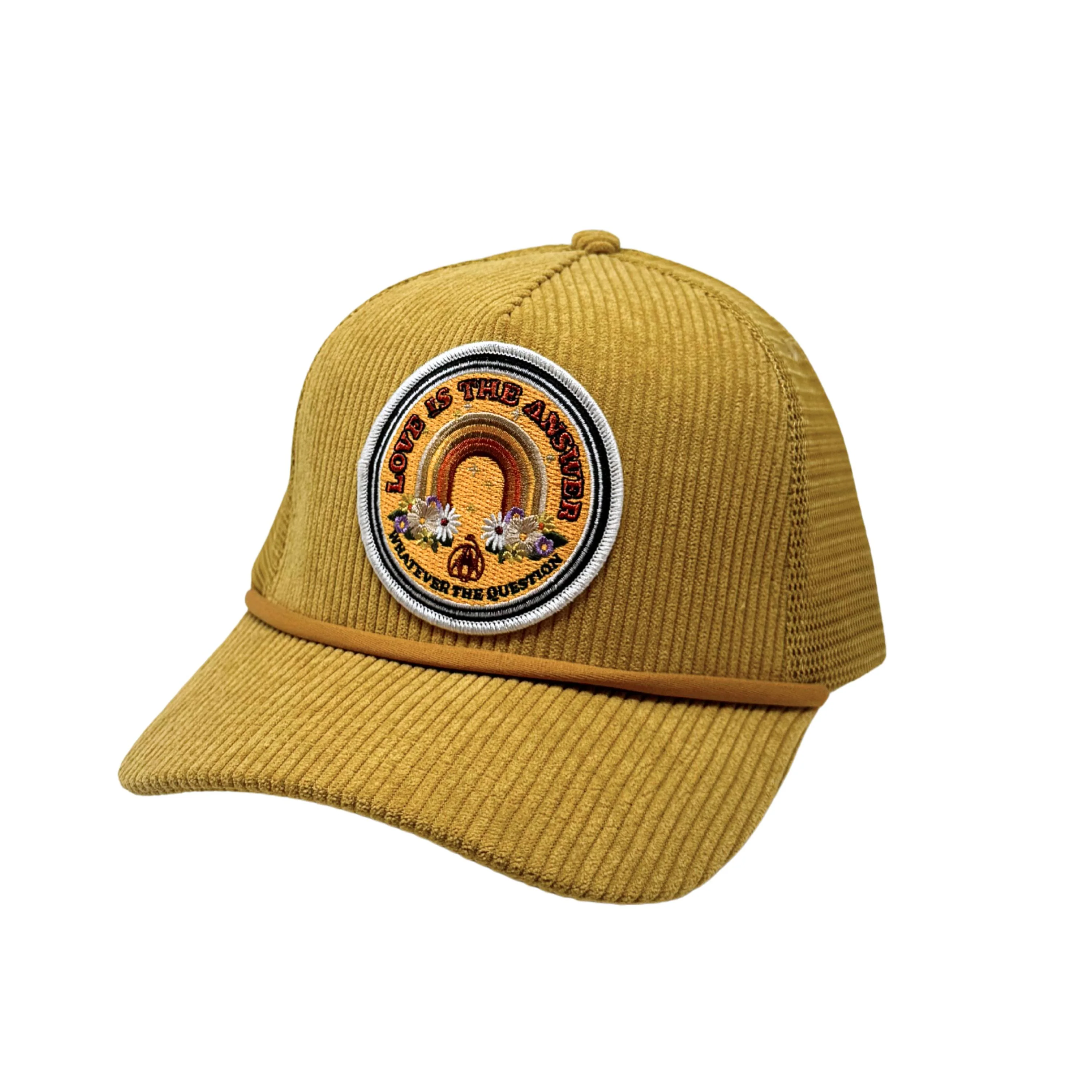 Gold corduroy trucker hat featuring an embroidered patch with the inspiring message "Love is the Answer, Whatever the Question"