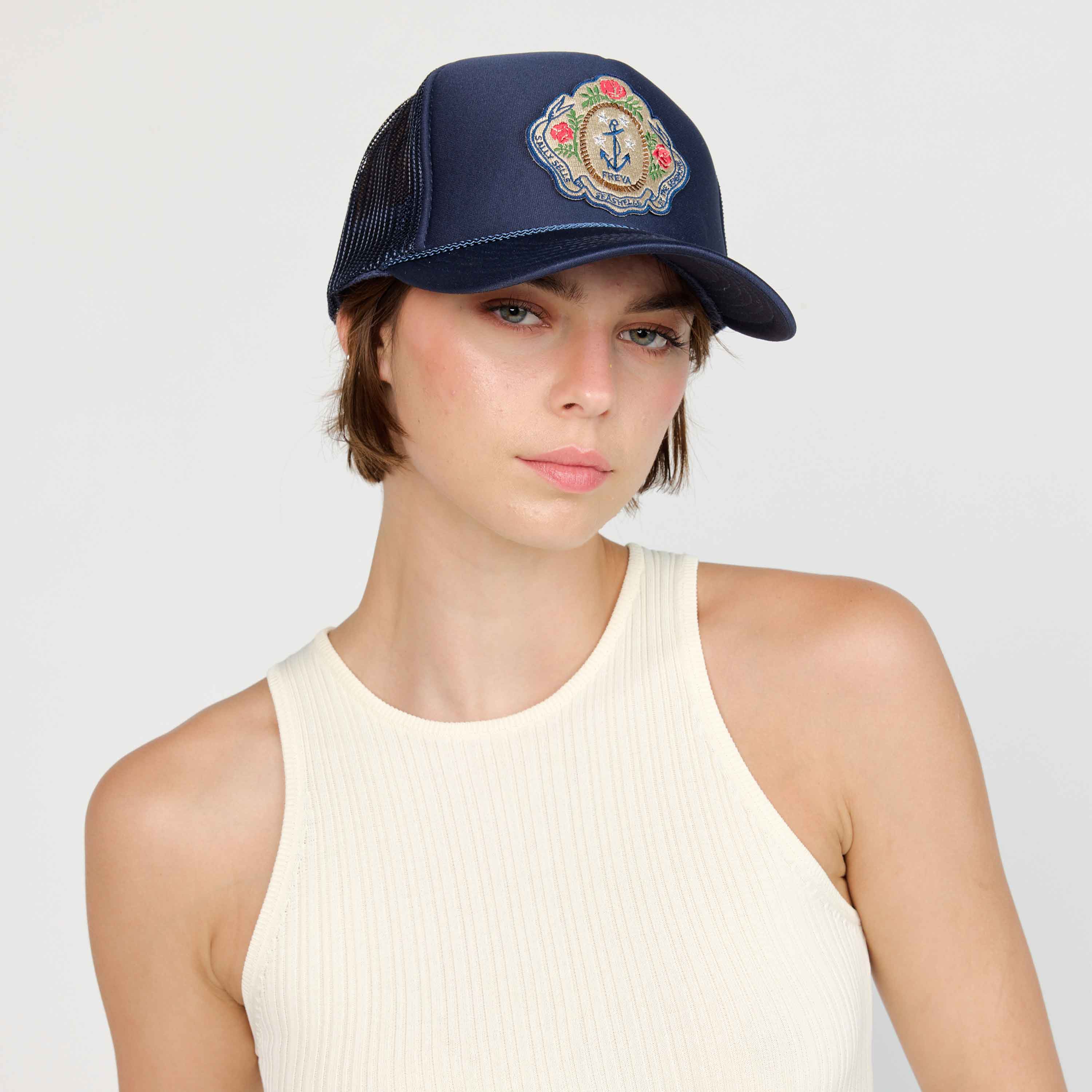 - Classic trucker hat adorned with our embroidered vintage-inspired Sally Sells Seashells By The Seashore patch.